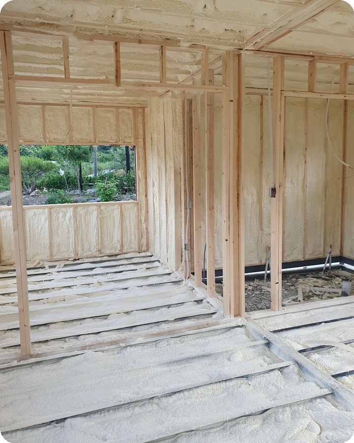 벽체 골조 사이, 천장 구조, 바닥 프레임까지 자연스럽게 퍼지면서